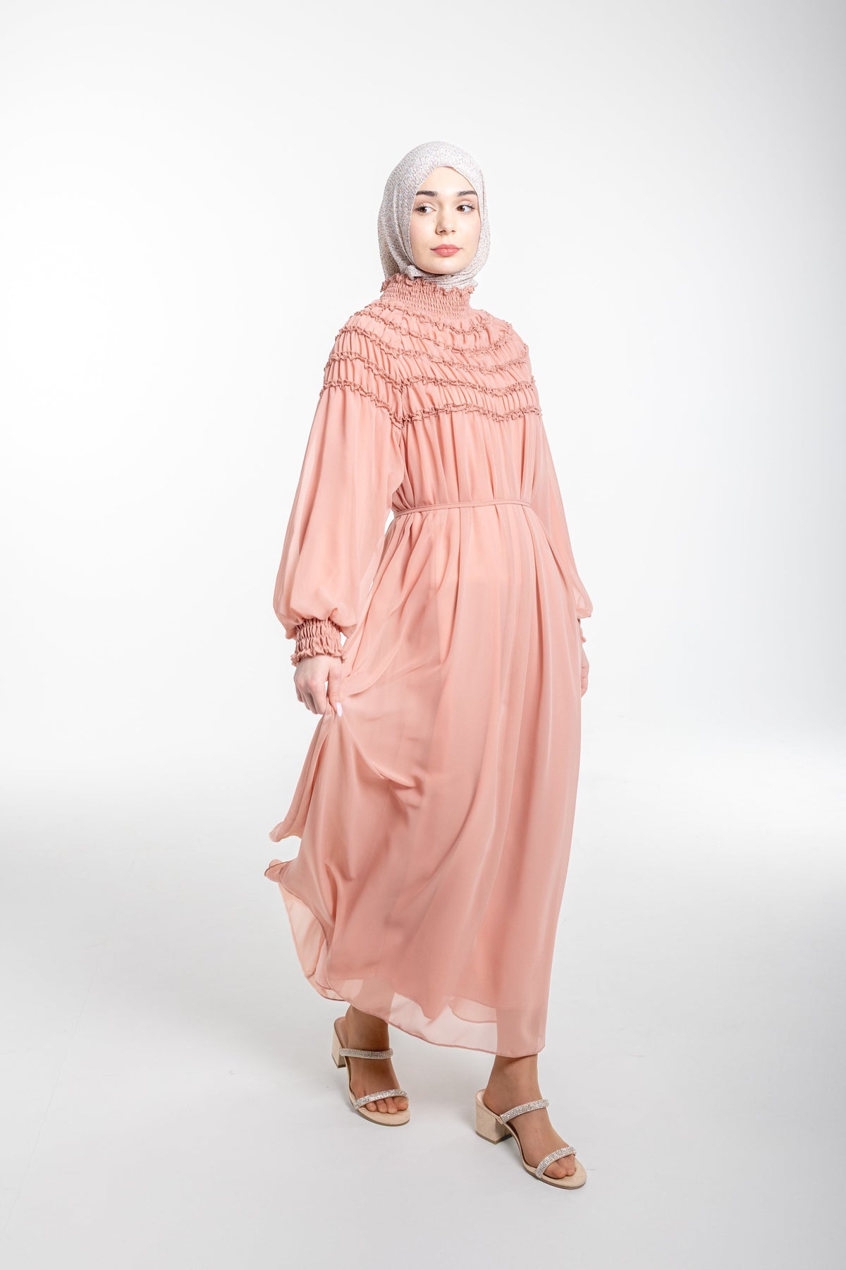 The Sienna Shirred Evening Modest Dress is a refined statement piece that brings together sophisticated textures and graceful structure. Crafted from lightweight chiffon and fully lined for coverage, this design features a high shirred neckline, gathered sleeves, and a bodice adorned with layered ruffle detailing for depth and softness. The removable belt allows for optional waist definition, while the hidden back zipper ensures a smooth, polished finish. Perfect for special occasions, evening events, or formal gatherings where elegance meets ease.